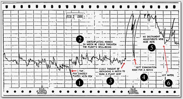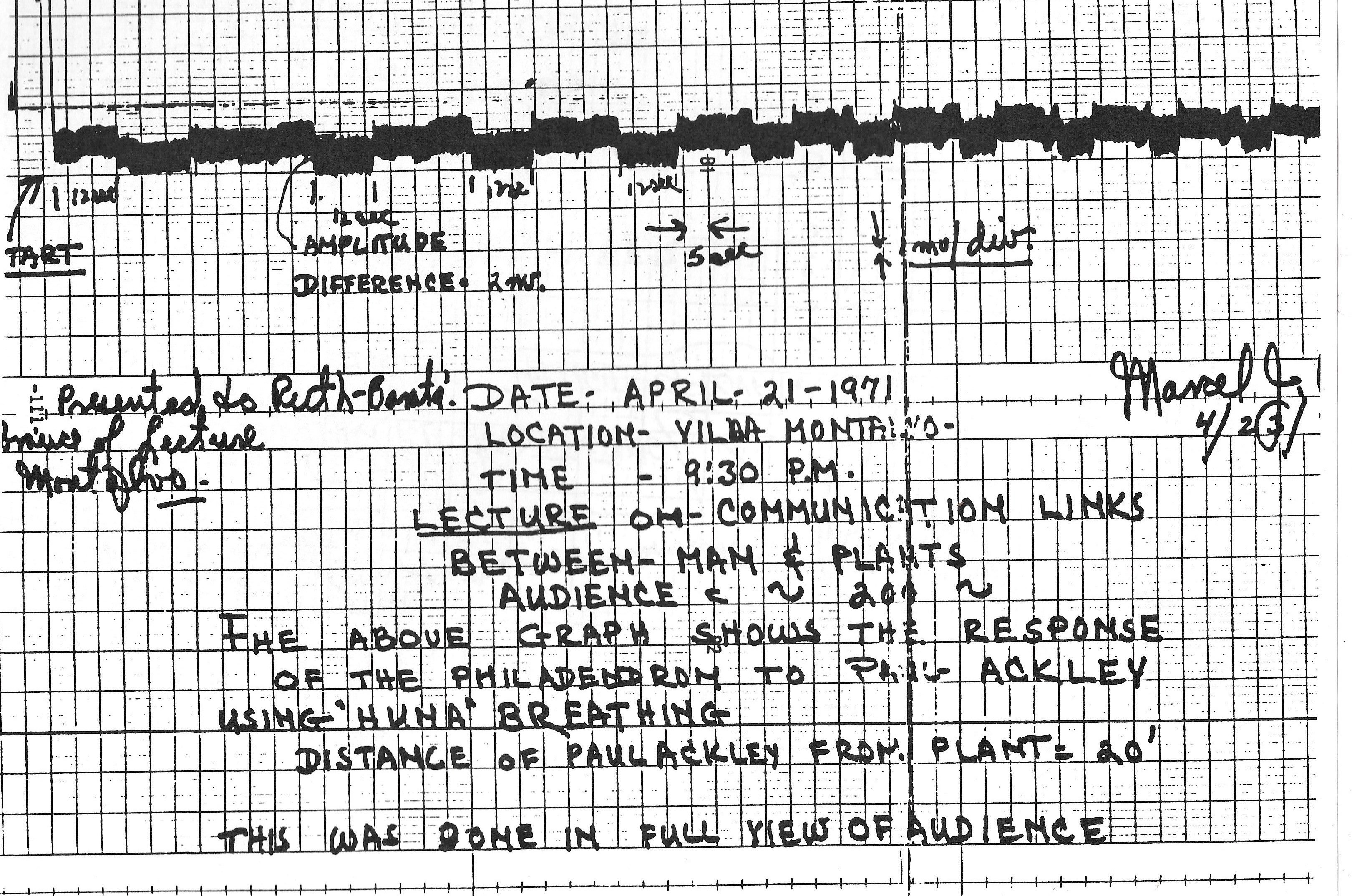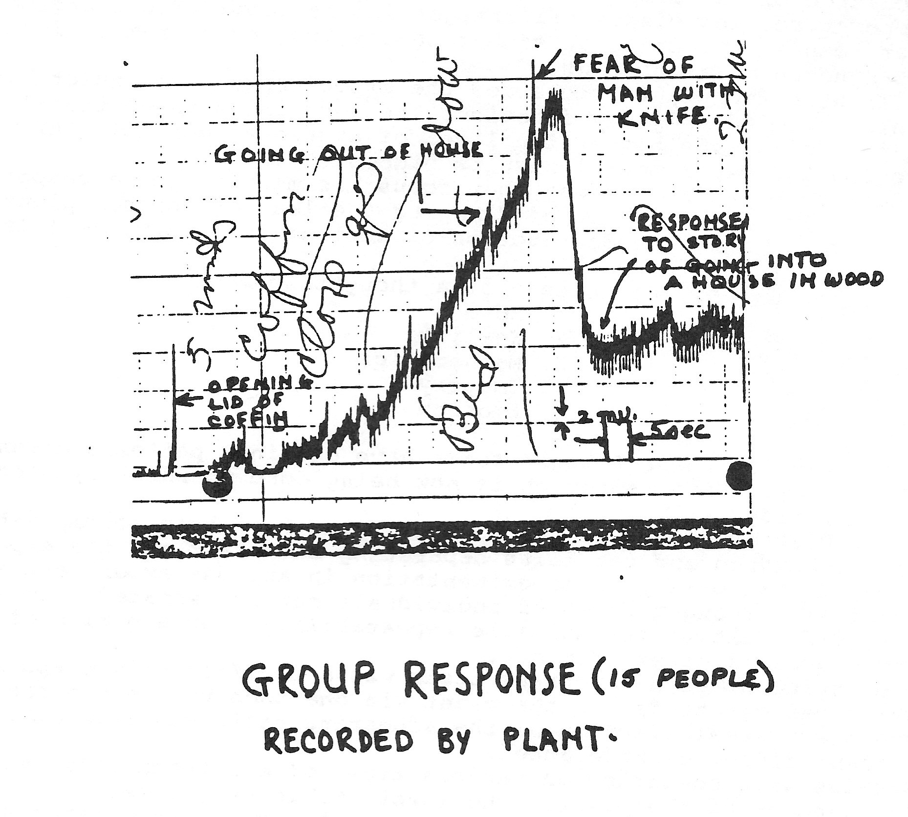 In the graph above we the response of the philodendron registering a group of people listening to a scary story. We can see that the peak response happens when, according to the story, there is a man in the house with a big knife. The response of the plant is actually to the fear being experienced by the group of listeners.