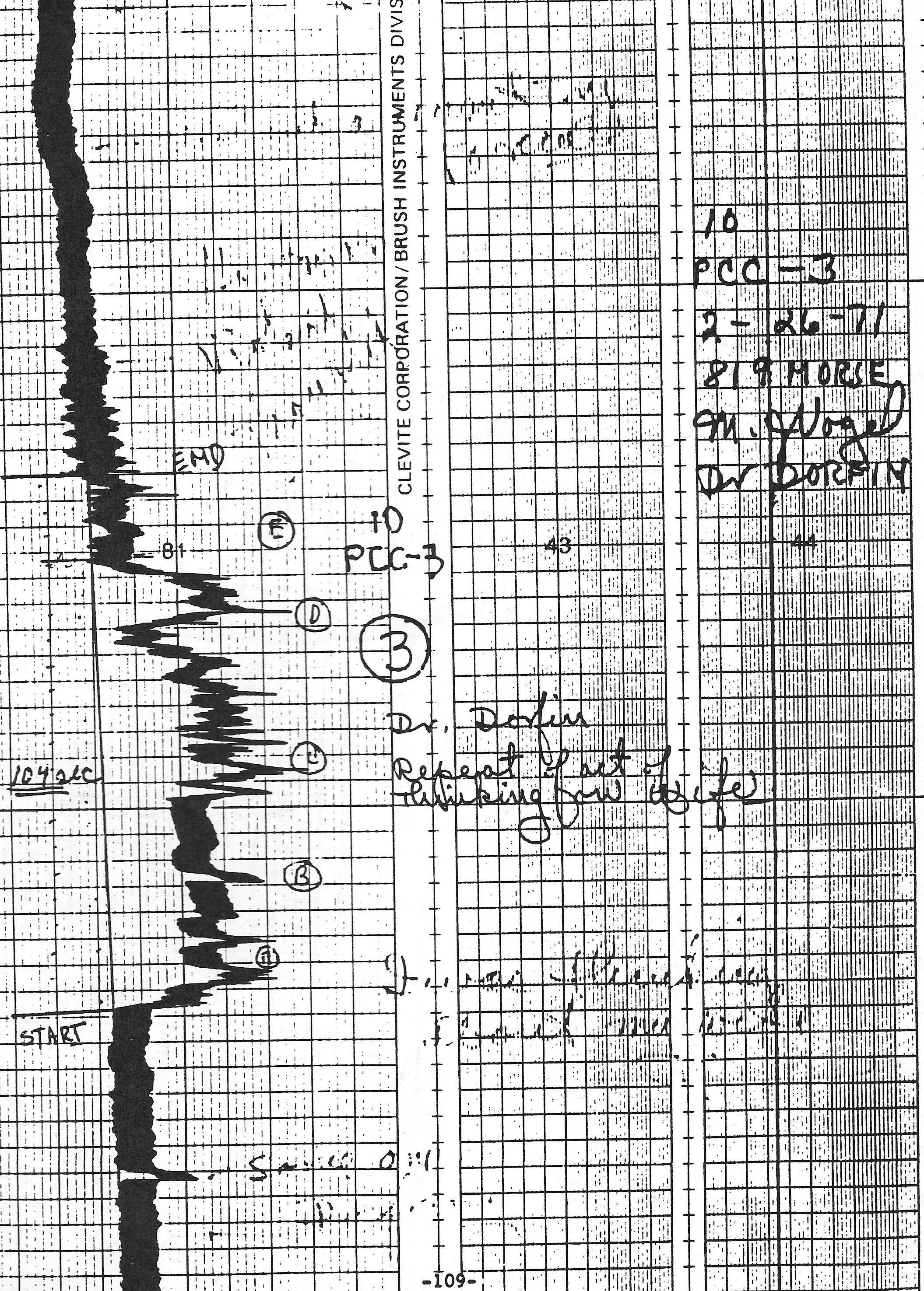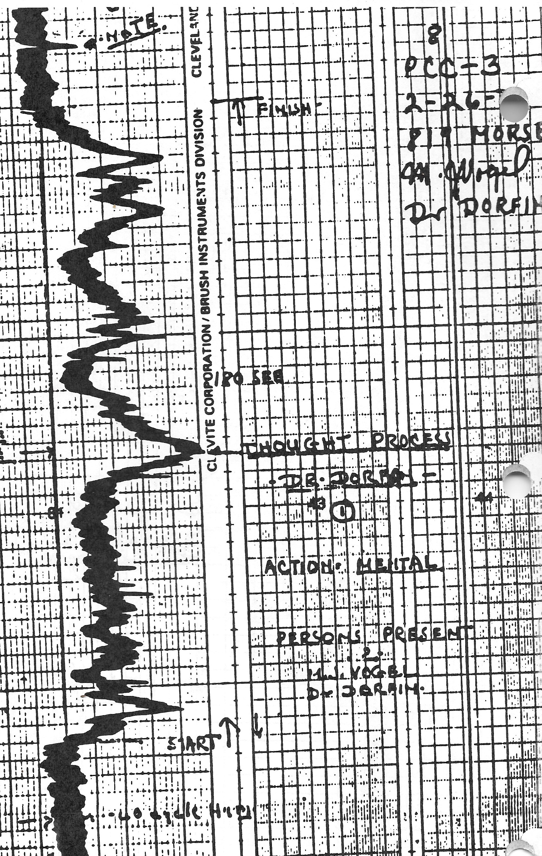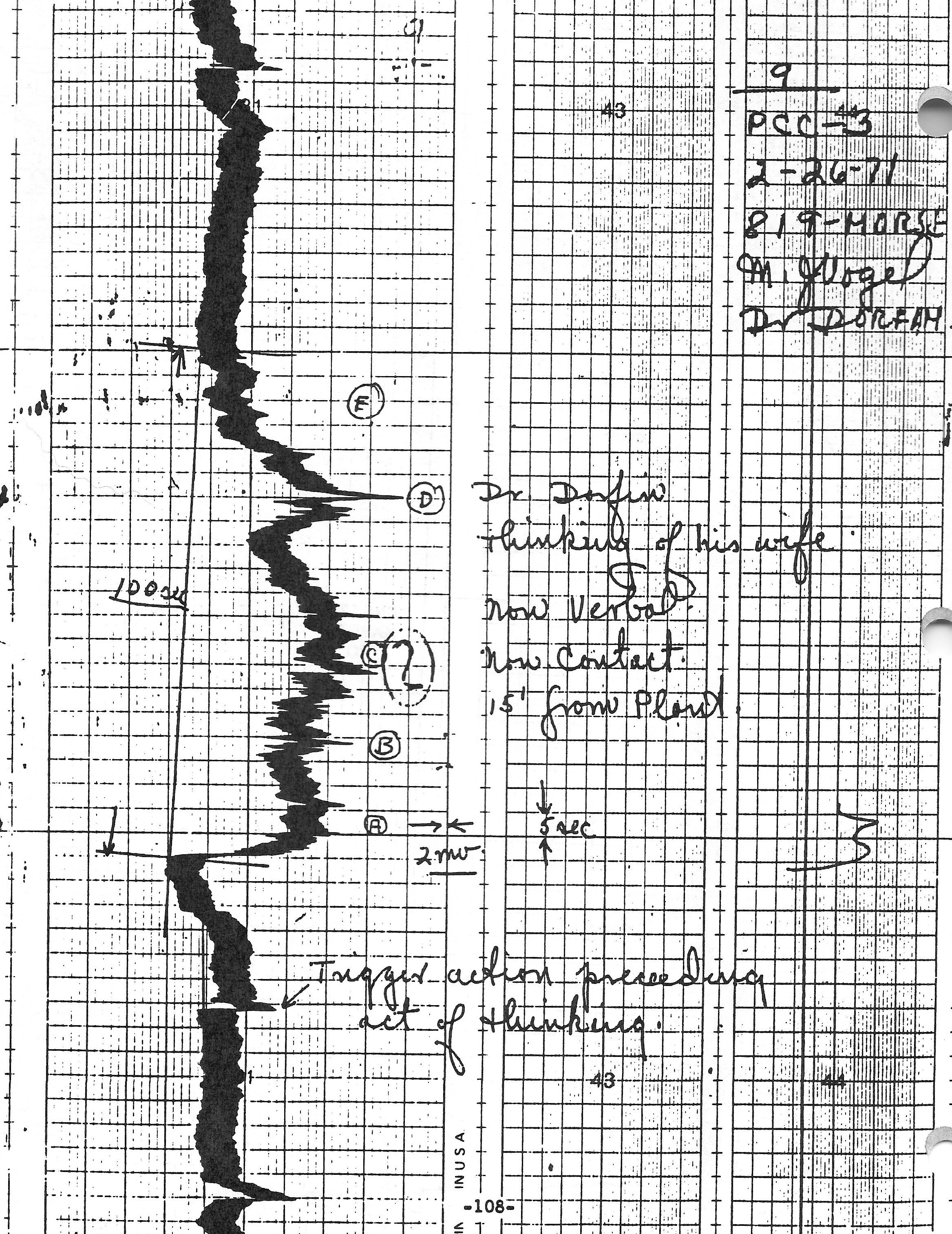 In the above graph we see Dr. Dorfin repeating the thought of loving his wife. The pattern is virtually the same as in the previous example. At this point Marcel realizes that there could be an identifiable language of "squiggles". That is, without knowing the content ahead of time, one could identify the nature of the trigger by the shape of the "squiggle".