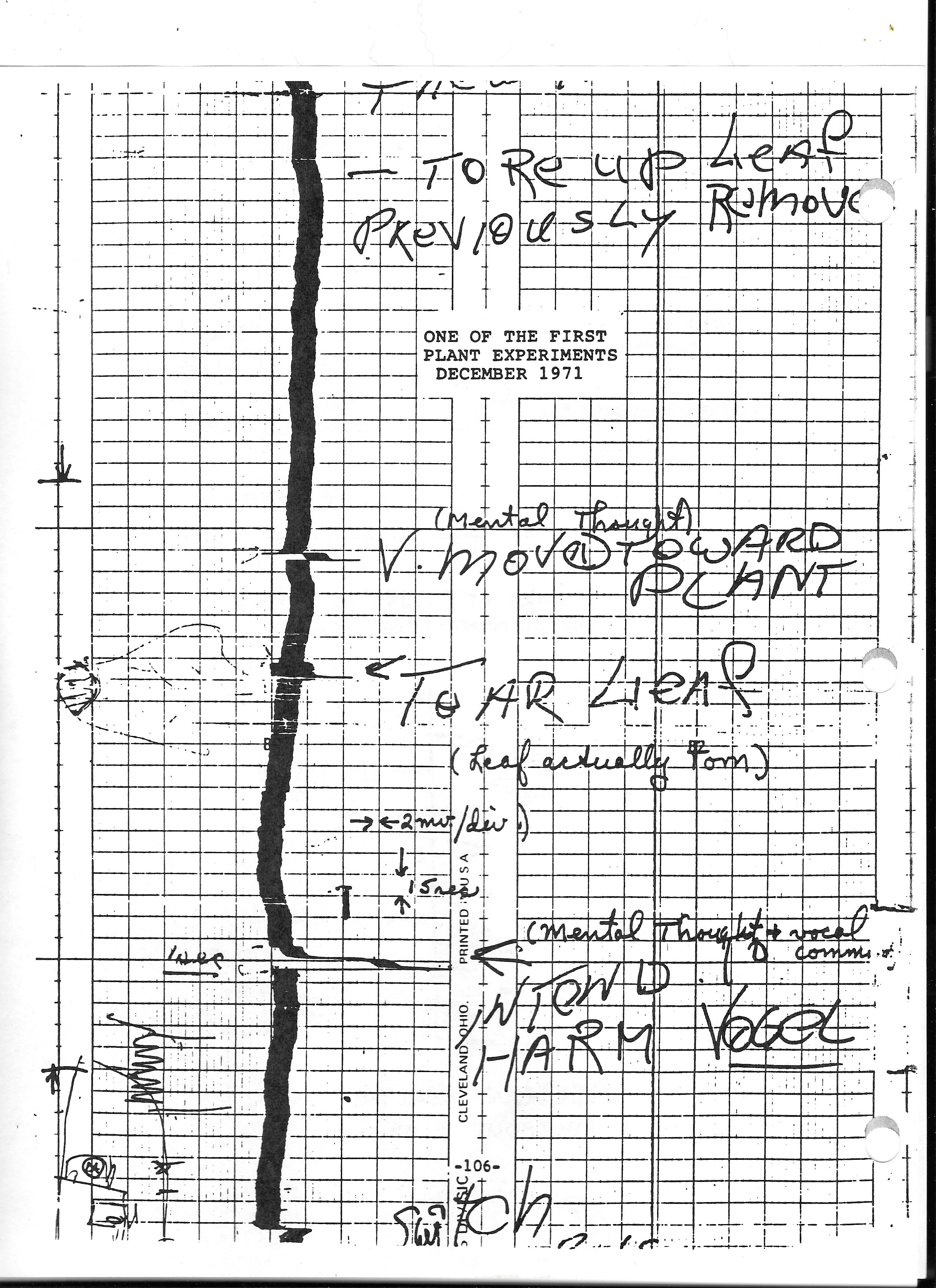 In the above graph, an associate of Marcel's, Dr. Dorfin, has a loving thought of his wife. There is a trigger prior to Dr. Dorfin actually forming the thought. There is a 100 second time period in which the Dr. has the thought as he approaches the plant from about 15 ft. away (point "B"-"C"). At point "C" Dr. Dorfin verbalizes his thought and at point "D" he holds the thought just in his mind.