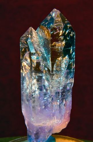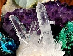The name crystal is derived from the Greek word "KRYSTALLOS" meaning ice or frozen water. Ancient belief, from the works of Pliny, is that rock crystal is formed by the action of extreme cold upon water over long periods of time in mountain caverns. The ladies in Rome carried rock crystal spheres in their hands to cool themselves in summer. To the Japanese people, rock crystal symbolized purity and the infinite patience. To them it was the perfect jewel. To the Western Church the desire to keep oneself free from stain and to have a pure faith. Rock crystal (quartz) is silicon dioxide (SiO2) grown into a single crystal. The atoms of the crystal are arranged in a helical pattern along with a vertical crystal axis. This helical pattern may be right-handed or left-handed. The right-handed crystal shows a pyramidal face on the top right hand corner of the prism face below the rhombohedral terminations. The left-handed crystal shows this face on the top left corner. The hardness of this material on a Moh's scale of 1 to 10 is 7. Specific gravity is 2.651 and the refractive index is 1.544 to 1.553. Crystals are found in nature as hexagonal prisms having rhombohedral terminations. Crystal is a trigonal quartz system, developing an electric current when heated. Quartz is also piezo electric, meaning it will generate an electric current when subjected to mechanical pressure. This property is used in pressure gauges, cigarette lighters and gas lighters found in many homes. When electric current is passed across a quartz crystal it becomes strained or deformed. This property is used in the movement of quartz clocks and watches. The fire used in Eleusian Mysteries was produced by laying rock crystal on wood chips so that the sun would shine through the crystal. The wood would first smoke and then burst into flame. This, claimed the Keepers of the Temple, was the best type of fire and most appreciated by the Gods. The Cherokee considered rock crystal to be a most powerful talisman that insured a successful hunt. Small crystal stones are utilized by the Australian aborigines in the preparation of talismans and amulets which they feel have the power to protect them from the demons which dwell in the bush and from the evil eye. Sir Walter Scott relates that the Highlanders call rock crystal the Stone of Power. In 1669 Nicolaus Steno, a Dane, wrote De Solido Intra Solidum Naturaliter. He rejected the rock crystal ice theory. He realized that crystals grew by the addition of new layers, the particles of which came out of a solution. The largest recorded single crystal is about 20 feet long, several feet thick and weighing about 40 tons.