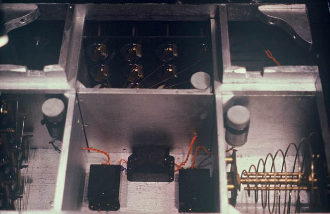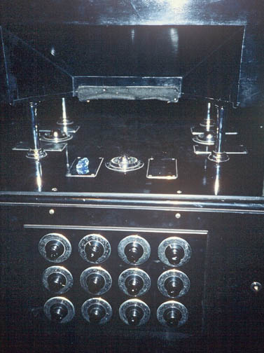 When it was time to try the first exposure I stepped back about forty feet from the camera and said "Let's take a frontal view of my body" and faced the camera. One of the plates was chosen randomly and put into the camera. The switch was turned on for 14 seconds. I felt nothing in my body and noted that to my associates. The next plate was loaded and when the switch was turned on I immediately felt a pressure in the solar plexus and thymus region of my body. I began to sway and noted this effect verbally. Both plates were developed. The first had not been charged and was totally free from any image or fogging. The second plate was excessively overexposed and would not clear in the hypo bath after five minutes. I reached in and touched the plate and when I lifted it out from the hypo into the red safe light, it immediately cleared. There was an image of a spiral of energy on the glass plate, with points or light scattered throughout the plate. 5the experiment was repeated three times in a row with exactly the same results. An untreated plate in the De La Warr camera gave no image and the treated plate produced images. I then said" Let us see what a side view would look like". We followed the same procedure with side views and now we had a three fold flame emerging from the plea. This was repeated a number of times. These events were observed y David Tansley, Lavender Dower, and Elizabeth Baerlein. The photographic glass plates were Ilford ordinary #N.30 glass, with an Ilford meter setting of 16 degrees and the speed group A, black and white. The photographic developer was B.72 and the fixer was Hypo (sodium hyposulfate). I left the crystal with the two ladies and they worked for months after I left with no apparent success in producing any images. Images can be formed on photographic film purely by the intention of the operator as in the case of Ted Serios, but there is no control over the image production or the capacity to get repeatable results in any one event. What does the De La Warr camera contain? When Lavender Dower loaned me the camera, I took it apart, carefully measured and photographed the equipment. The lower and larger box contains three chambers, with the dimensions of the "King's Chamber", in which an electrical vibrator produces a tone. There are 12 dials in three rows. They are attached to various lengths of wire that lead to a magnet which is set in a vertical position. Two of these units are identical and they are tuned by a rubbing plate. the third unit is a spiral of wire which can be tuned to various positions on the ascending or descending spiral form. this, too, leads to a magnet set with the north pole in the up position and is tuned accordingly. There is another box on top which is separated by posts. This holds the film plate holder and contains within it three parabolic reflectors aligned to each or he magnetic rods. he focal point of the parabolic reflectors is the glass pate. The plate holder is completely light tight. To operate the equipment, it is rotated until it is facing due west.