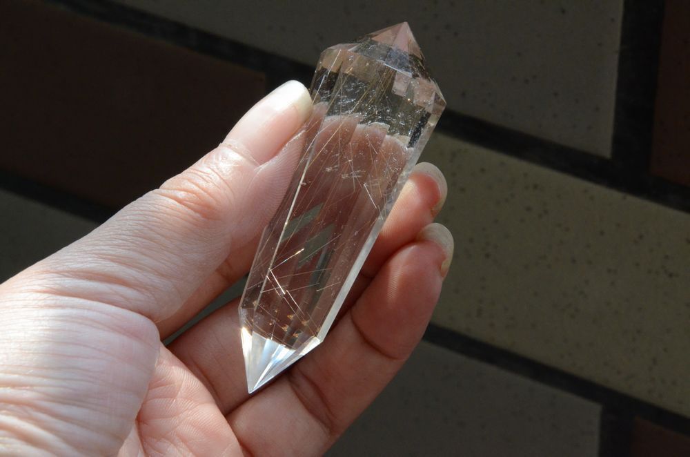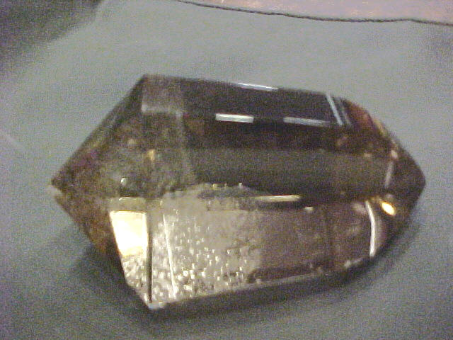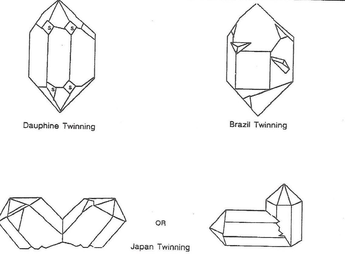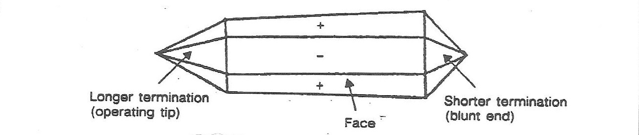a little different happens at the The easiest form to see in the termination of quartz is a positive rhombohedron. It usually forms the dominant or larger set of three faces that form the tip. These faces usually have more luster or are brighter than the three smaller faces. In crystal drawings the positive rhombohedron is designated by “r”. The smaller or subordinate three faces of the termination are formed by a negative rhombohedron that is designated by “z”. Trigonal Trapezohedrons The positive right trigonal trapezohedron that forms is usually not expressed or visible on a crystal of quartz. When it is seen at the junction of the two prism faces (“m”) and the positive rhombohedron (“r”) and shows as a trapezohedral planar shape with high luster or brightness and is designated by the letter “x”. Trigonal Pyramids This form will be found at the junction of the positive rhombohedron (“r”) and the prism face (“m”), which is in line vertically with the negative rhombohedron (“z”). It forms an elongated rhombus shaped face and is rarely present. These forms can be used to determine, externally, the “handedness” of a quartz crystal. This means that to determine the direction in which the SiO2 molecules are spiraling or braided around the “C” axis of the crystal: