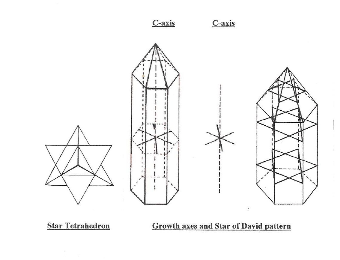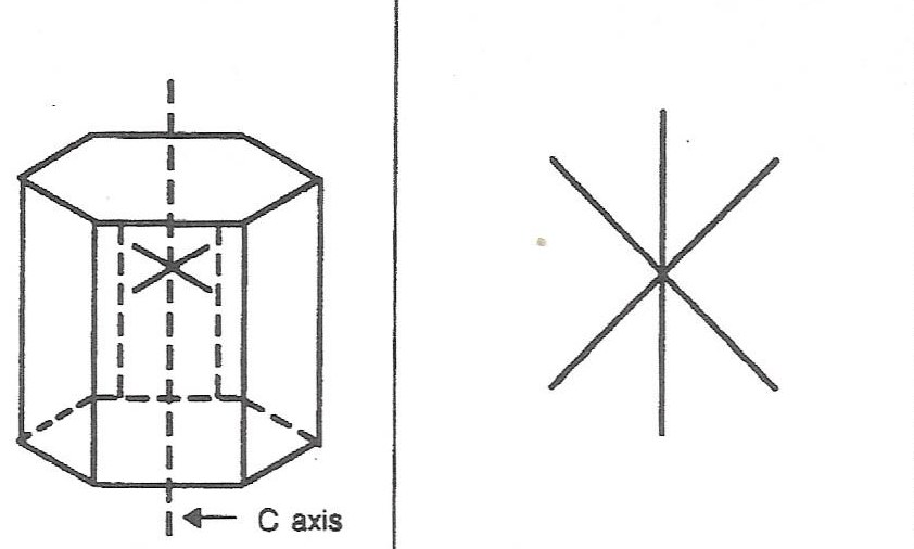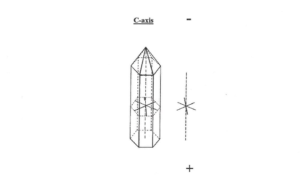 the chlorine atom has an extra electron, giving it a negative charge (Cl). Another type of bond that can form between atoms is a covalent bond. This occurs when the outermost shells of two atoms are not filled to the maximum. This can happen between two atoms of the same kind. Even though the atoms may be in electrical balance, because there is a strong tendency for electrons to travel in pairs, the two atoms will “decide” to share electrons in order to fill the outermost shells of each. The term “valence” refers to the name given to the electrons that fill the shells. They are called valence electrons. Atoms have a tendency to “want” the outermost shells filled so that there are four pairs of electrons in orbit. An example of this type of bonding is found in quartz crystals. These are the building blocks of matter and therefore of all crystals. Atoms form molecules that align themselves in particular geometric patterns depending upon the type of crystal that is forming. Each crystal type is demonstrating a particular aspect of consciousness that is able to use the lines of force through which the molecular or chemical constituents will pattern themselves. It is as if the consciousness “rides” the natural geometry created by the chemistry of the crystals to generate a form through which to manifest. The various manifestations of consciousness can be seen in the geometry demonstrated by the primary crystal classifications. The atoms of any crystal form a unit cell of consciousness, which then create a spatial lattice. A lattice is a geometrical arrangement of points in space. If you are not familiar with geometry or crystallography or you think it is difficult, just read this material slowly and use the illustrations. Don’t let the big words intimidate you. It’s the concepts that are important, not the technical language. I realize that in parts some of these descriptions sound like directions on how to assemble what you thought was a simple piece of furniture and you end up needing a dictionary just to read the instructions. Go slowly, use the pictures and be concerned only with conclusions. If you persevere a little, the rewards will be well worthwhile. Love and geometry is the basis of healing and consciousness work although it is not always articulated this way. To understand these dynamics about the crystal is to understand more about yourself. In the three dimensional world there must be at least three points involved as co-ordinates to determine the position and shape of an object. In crystals these are the lines of force or axes along which the chemical constituents will grow. The vertical axis is called the “C” or central axis. It has a positive and negative pole. C axis C axis
