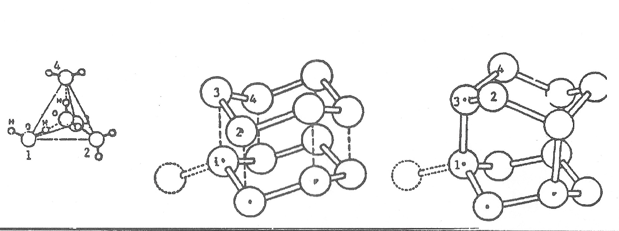 Water Molecule The fundamental geometrical pattern of quartz and water is the tetrahedron. Water molecules, bound together, form tetrahedra in the form of tilted rings. This tilting happens because of the bonding angle that exists between any three water molecules. This angle is approximately 110 degrees. The normal flat hexagonal pattern formed by the bonding of tetrahedra has angles of 120 degrees. Water molecules with smaller angles, if they are to be formed into a hexagon, must have an uneven structure that is not in a flat plane, but instead is three-dimensional. This uneven structure is formed by what is called the angle of tilt. This angle can be between 20 degrees and 60 degrees, but the most common angle is 26 degrees. This is where the intermolecular bond is the strongest and it happens to be half of the interlattice angle of quartz. The second most common bonding angle for water is 54 degrees. This is also quite close to the interlattice angle of quartz. The interlattice angle of a crystal is related to the basal angle. The basal angle is ½ of the angle of the tip of the crystal. The interlattice angle of quartz is 90 degrees minus the basal angle, which is 38 degrees. Therefore the interlattice angle is 52 degrees. This is also the angle of the base of the Cheops pyramid.